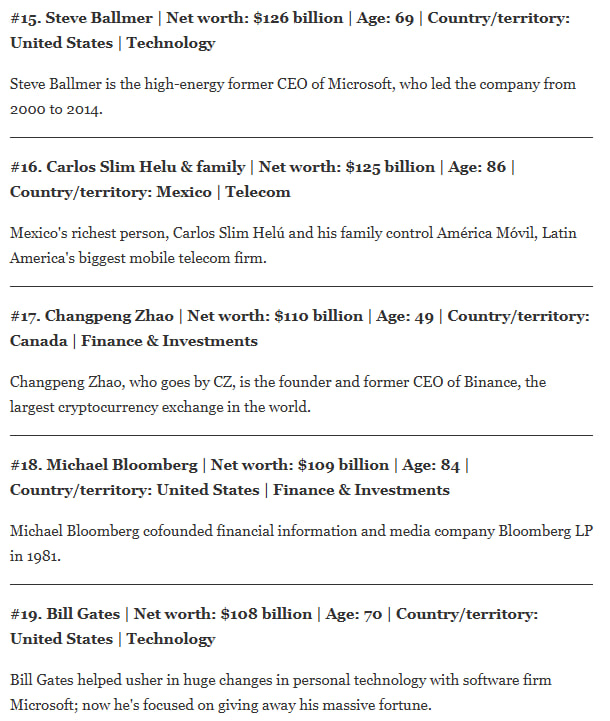 Σύμφωνα με τα επίσημα στοιχεία που δόθηκαν στη δημοσιότητα, ο Changpeng Zhao, γνωστός ευρέως στον χώρο απλά ως CZ, κατέλαβε τη 17η θέση στη λίστα με τους πλουσιότερους ανθρώπους του πλανήτη. Με την καθαρή του αξία να εκτοξεύεται στα 110 δισεκατομμύρια δολάρια, ο ιδρυτής και πρώην διευθύνων σύμβουλος της Binance δεν εδραιώνει απλά τη θέση του στην παγκόσμια οικονομική ελίτ, αλλά προκαλεί πραγματικό σεισμό στο παραδοσιακό κατεστημένο αφήνοντας πίσω του ιστορικά ονόματα. Συγκεκριμένα, ο πανίσχυρος άνδρας της Wall Street και των παγκόσμιων media, Michael Bloomberg, βρέθηκε μόλις στη 18η θέση με 109 δισεκατομμύρια δολάρια. Το πραγματικό χτύπημα, ωστόσο, ήρθε μία θέση πιο κάτω. Στο νούμερο 19 συναντάμε τον Bill Gates, τον άνθρωπο που για δεκαετίες μονοπωλούσε την πρώτη θέση της σχετικής λίστας, με περιουσία 108 δισεκατομμυρίων δολαρίων.