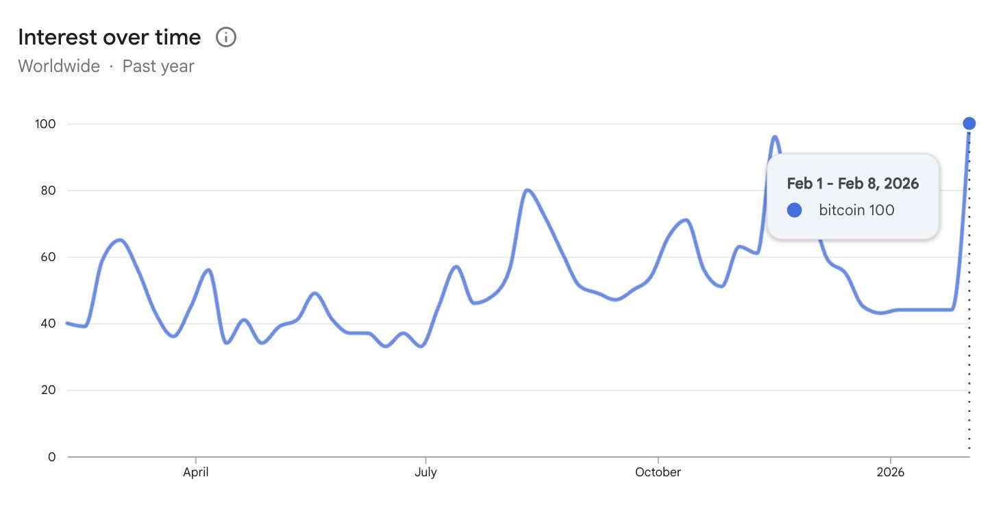 Google Trends chart showing Bitcoin search interest hitting a 12-month high in early February 2026 after BTC price crash from $81,500 to $60,000