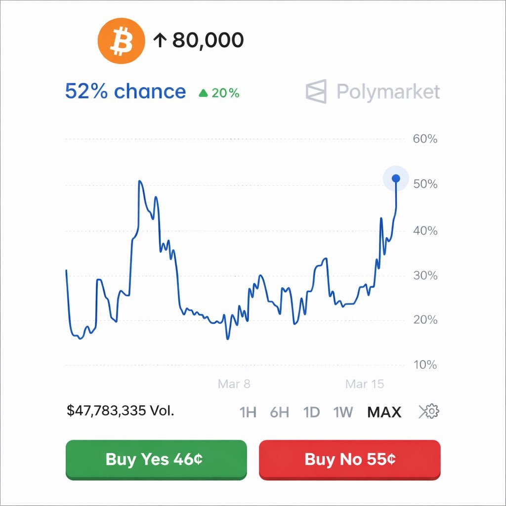 Η είδηση που κάνει τον γύρο του κόσμου ξεκίνησε από το Polymarket, την κορυφαία αποκεντρωμένη πλατφόρμα προβλέψεων, όπου η πιθανότητα το Bitcoin να αγγίξει τα 80.000 δολάρια εντός του Μαρτίου εκτινάχθηκε στο ιστορικό υψηλό του 52%. Η σημασία αυτού του ποσοστού είναι τεράστια, καθώς δεν πρόκειται για μια απλή εκτίμηση ενός αναλυτή, αλλά για το αποτέλεσμα πραγματικών στοιχημάτων αξίας δεκάδων εκατομμυρίων δολαρίων.