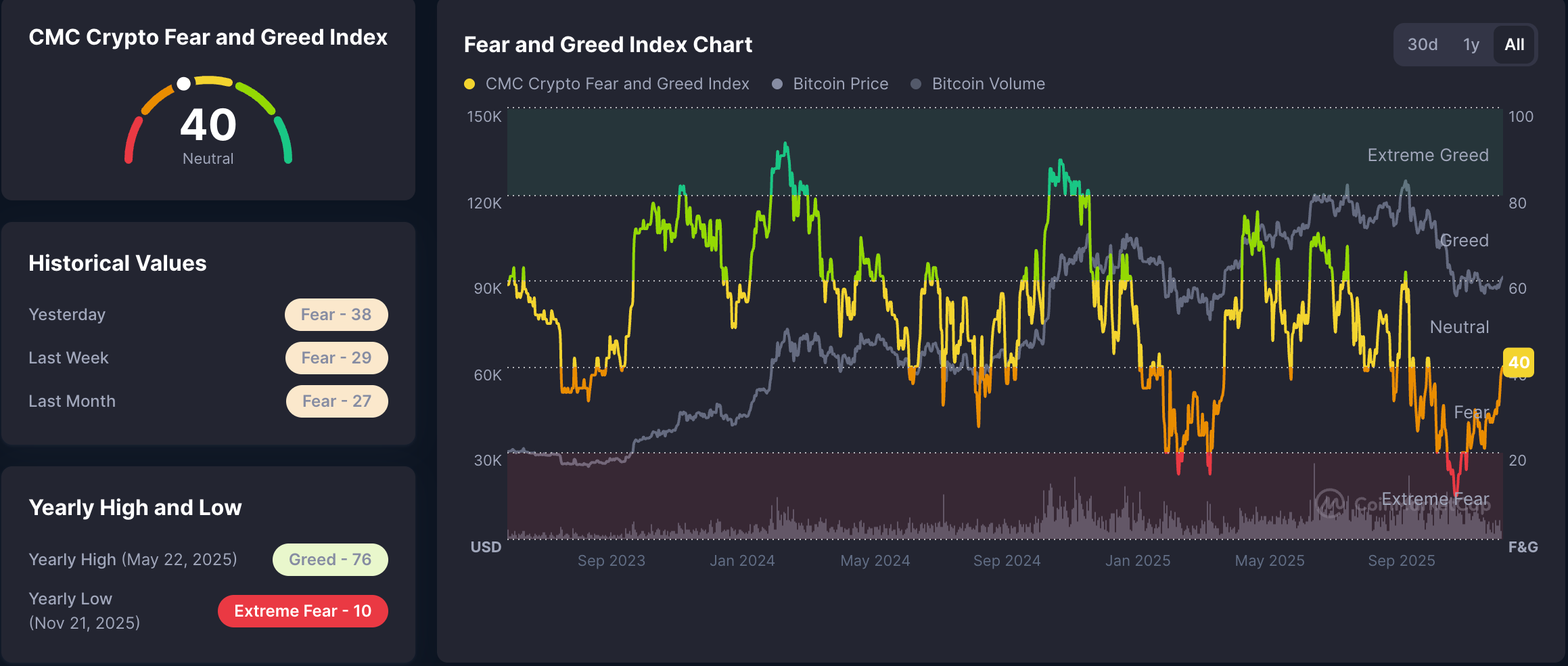 Ο δείκτης “Crypto Fear and Greed Index” γύρισε ξανά σε Neutral την Κυριακή, γράφοντας 40/100. Είναι η πρώτη φορά από τον Οκτώβριο που η αγορά βγαίνει από τη ζώνη “Fear”, κάτι που πολλοί traders διαβάζουν ως ένδειξη ότι η ψυχολογία αρχίζει να σταθεροποιείται.