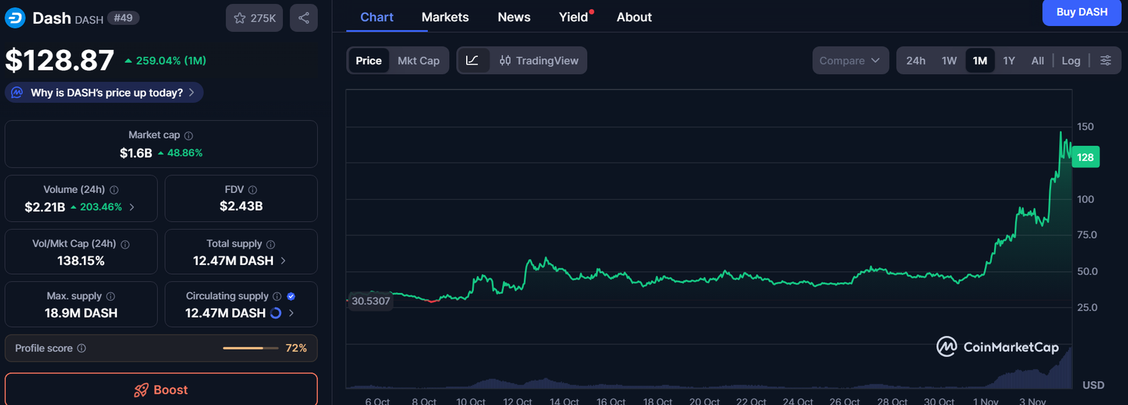 Το Dash, ένα από τα παλαιότερα και πιο αναγνωρίσιμα κρυπτονομίσματα των πρώτων χρόνων του Bitcoin, κάνει ξανά θόρυβο στην αγορά. Μέσα σε μόλις ένα μήνα, η τιμή του έχει εκτοξευθεί πάνω από 257%, ενώ μόνο το τελευταίο 24ωρο σημείωσε άνοδο 52%. Αυτή η εντυπωσιακή κίνηση έχει τραβήξει την προσοχή τόσο των επενδυτών όσο και των αναλυτών που προσπαθούν να εξηγήσουν τι κρύβεται πίσω από την αναγέννηση του Dash.