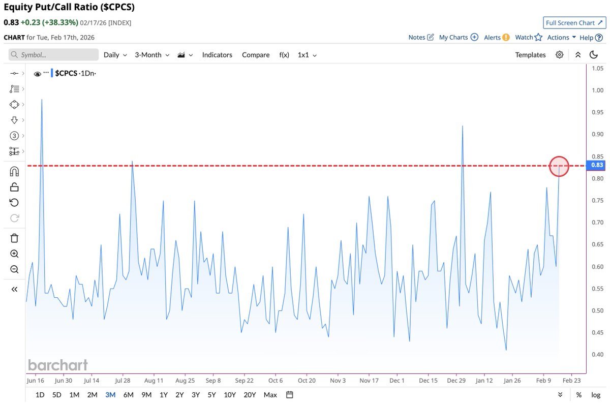 Το put/call ratio μετράει τη σχέση ανάμεσα στον όγκο των put options και των call options. Όταν ανεβαίνει, σημαίνει ότι περισσότερα κεφάλαια κατευθύνονται σε στοιχήματα ή hedges πτώσης, αντί για bullish τοποθετήσεις. Στην περίπτωση του equity-only put/call, το σήμα θεωρείται ακόμη πιο “καθαρό”, γιατί αφορά αποκλειστικά options πάνω σε μετοχές και όχι δείκτες, άρα αποτυπώνει άμεσα το risk sentiment στο stock picking.