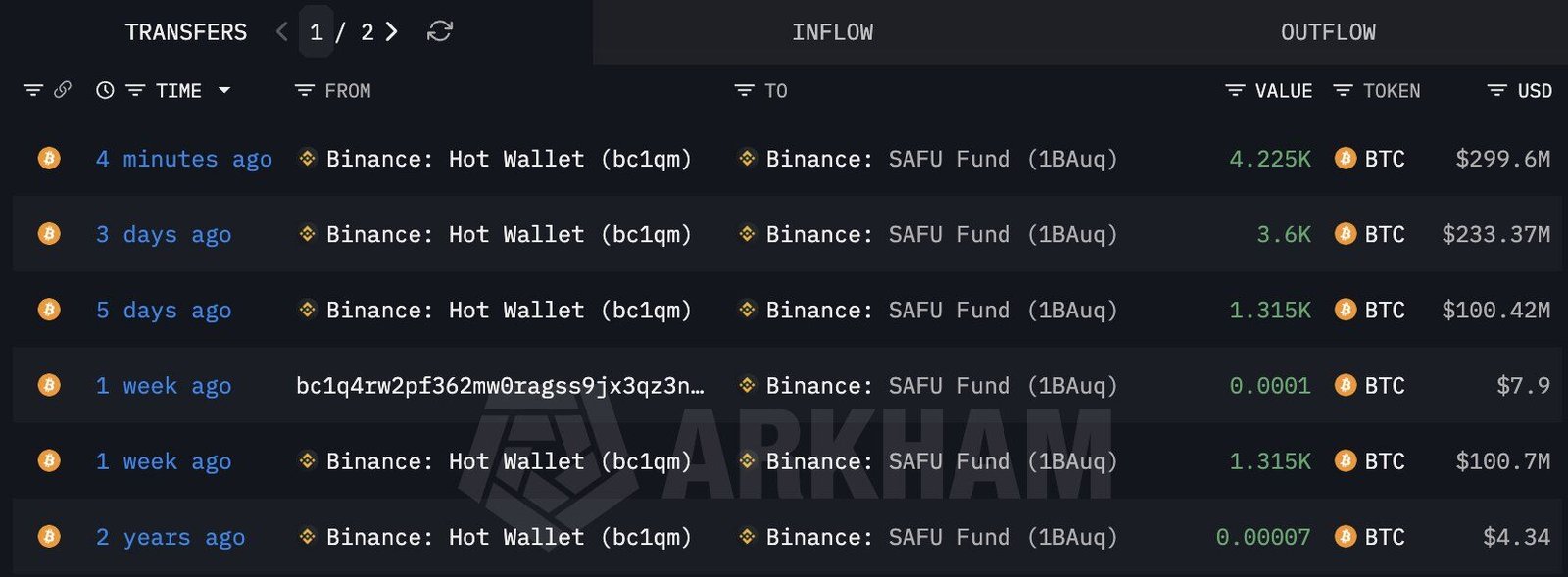 Μια ακόμα μεγάλη on-chain μεταφορά από τη Binance δεν πέρασε απαρατήρητη από τους αναλυτές. Το SAFU Fund, το ταμείο προστασίας χρηστών του μεγαλύτερου crypto exchange στον κόσμο, πρόσθεσε 4.225 Bitcoin αξίας περίπου $299,6 εκατ., ανεβάζοντας τα συνολικά του αποθέματα στα 10.455 BTC. Με βάση τις τρέχουσες τιμές, η αξία του fund κινείται πλέον στην περιοχή των $730–740 εκατ. και πλησιάζει ξεκάθαρα τον στρατηγικό στόχο του $1 δισ. σε Bitcoin.
