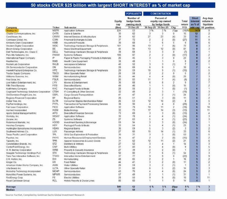 Η Wall Street έστειλε καθαρό μήνυμα: η Strategy (MSTR) βρίσκεται πλέον στην κορυφή της λίστας με τις μεγαλύτερες short θέσεις μεταξύ των αμερικανικών εταιρειών άνω των 25 δισ. δολαρίων κεφαλαιοποίησης. Το short interest αγγίζει περίπου το 14% της αγοραίας αξίας της μετοχής, ποσοστό που την τοποθετεί πάνω από τηλεπικοινωνιακούς κολοσσούς, τεχνολογικές εταιρείες και βαριά ονόματα του Nasdaq.