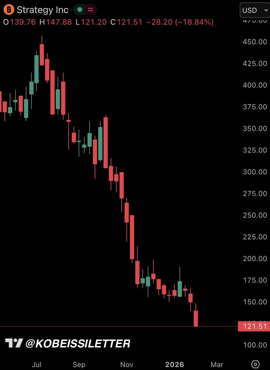 Στις τελευταίες συνεδριάσεις, το $MSTR κατρακύλησε έως τα επίπεδα των $120–$122, τιμές που είχαν να εμφανιστούν από το φθινόπωρο του 2024. Από το ιστορικό υψηλό του Νοεμβρίου 2024, όταν η μετοχή κινούνταν πάνω από τα $540, η συνολική πτώση φτάνει περίπου το -78%. Πρόκειται για μια από τις πιο βίαιες διορθώσεις σε μετοχή μεγάλης κεφαλαιοποίησης που συνδέεται άμεσα με την αγορά crypto.