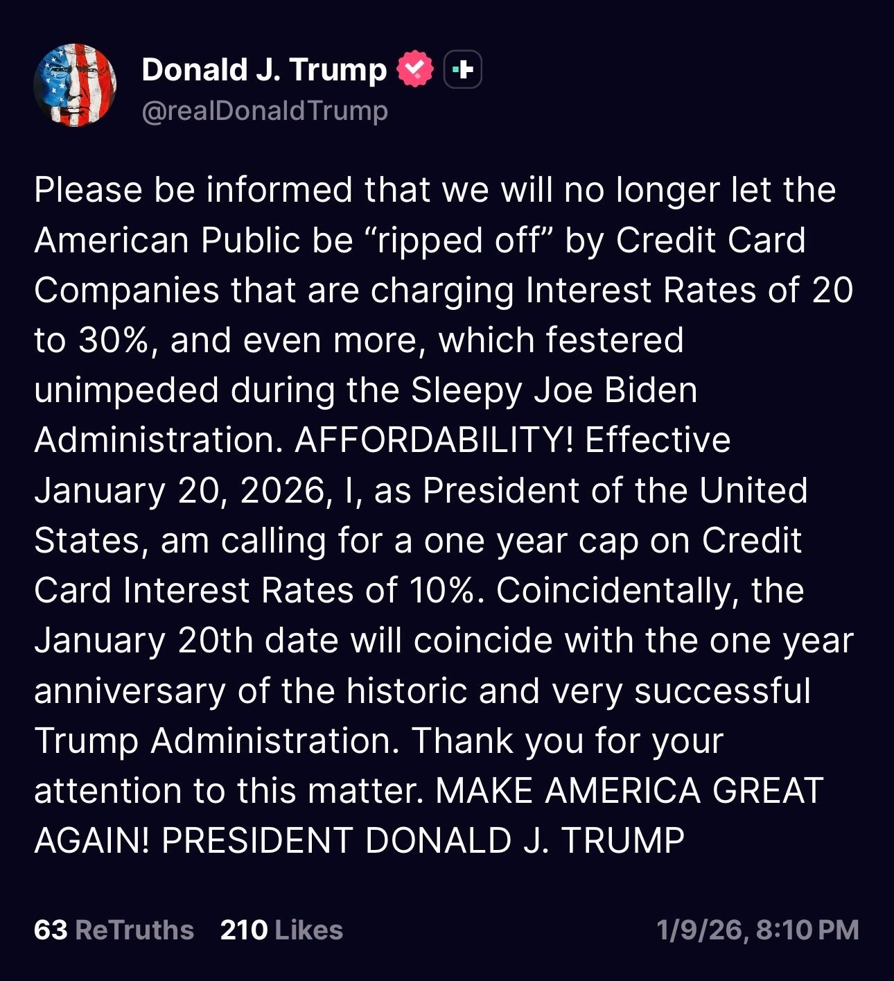 Ο Donald Trump έριξε μία δήλωση που μέσα σε λίγες ώρες άναψε φωτιά στην αμερικανική αγορά καταναλωτικής πίστης. Με ανάρτησή του στο Truth Social, κάλεσε σε επιβολή ανώτατου ορίου 10% στα επιτόκια πιστωτικών καρτών για ένα έτος, με ημερομηνία έναρξης την 20ή Ιανουαρίου 2026.