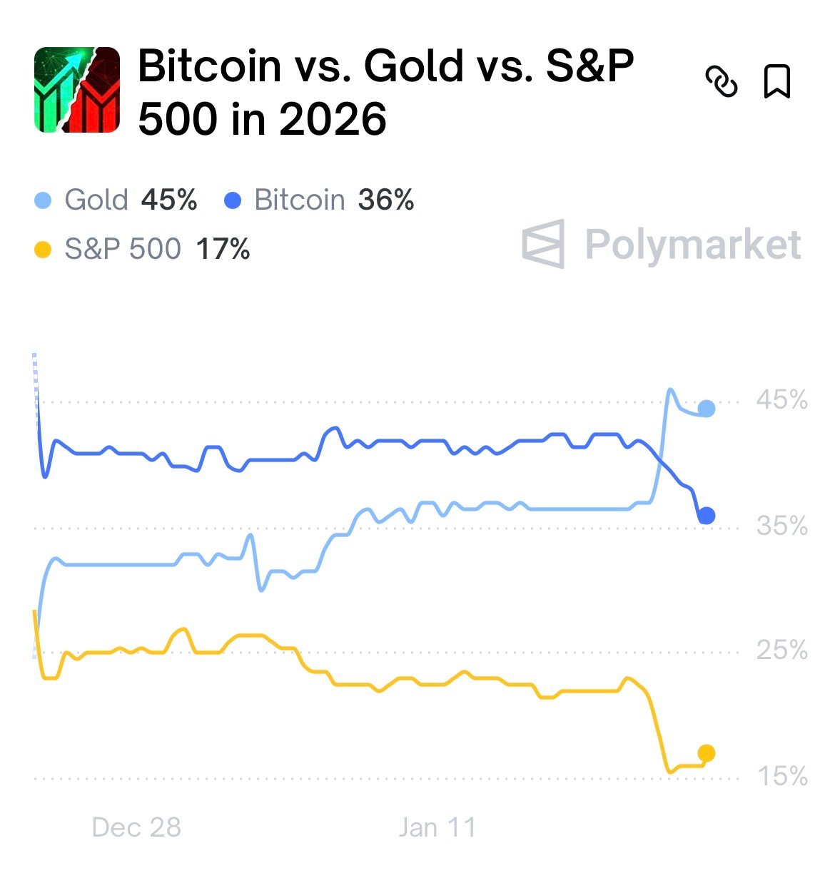 Τα τελευταία odds δείχνουν ξεκάθαρα τη στροφή: Gold 45%, Bitcoin 36%, S&P 500 17%. Για πρώτη φορά μετά από μήνες, το πολύτιμο μέταλλο περνά στην πρώτη θέση, ανατρέποντας την έως πρόσφατα κυρίαρχη εικόνα υπέρ του Bitcoin.