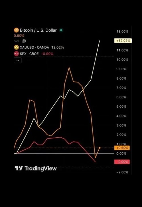 Τα γραφήματα από TradingView επιβεβαιώνουν την εικόνα. Σε πρόσφατη σύγκριση αποδόσεων, το χρυσάφι εμφανίζει άνοδο άνω του 12%, το Bitcoin κινείται κοντά στο +0,6%, ενώ ο S&P 500 καταγράφει αρνητική μεταβολή.