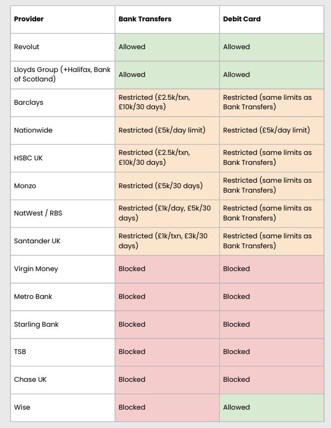 Στο Ηνωμένο Βασίλειο, αρκετοί μεγάλοι τραπεζικοί οργανισμοί έχουν επιβάλει caps σε μεταφορές προς πλατφόρμες κρυπτονομισμάτων. Σε ορισμένες περιπτώσεις, το όριο αγγίζει τις £2.500 ανά συναλλαγή και £10.000 σε κυλιόμενο διάστημα 30 ημερών. Άλλες τράπεζες θέτουν ημερήσιο πλαφόν, όπως £5.000 ανά ημέρα, είτε για τραπεζικές μεταφορές είτε για πληρωμές με debit card. Υπάρχουν και περιπτώσεις πλήρους μπλοκαρίσματος, όπου τόσο τα bank transfers όσο και οι συναλλαγές με κάρτα απορρίπτονται αυτόματα.