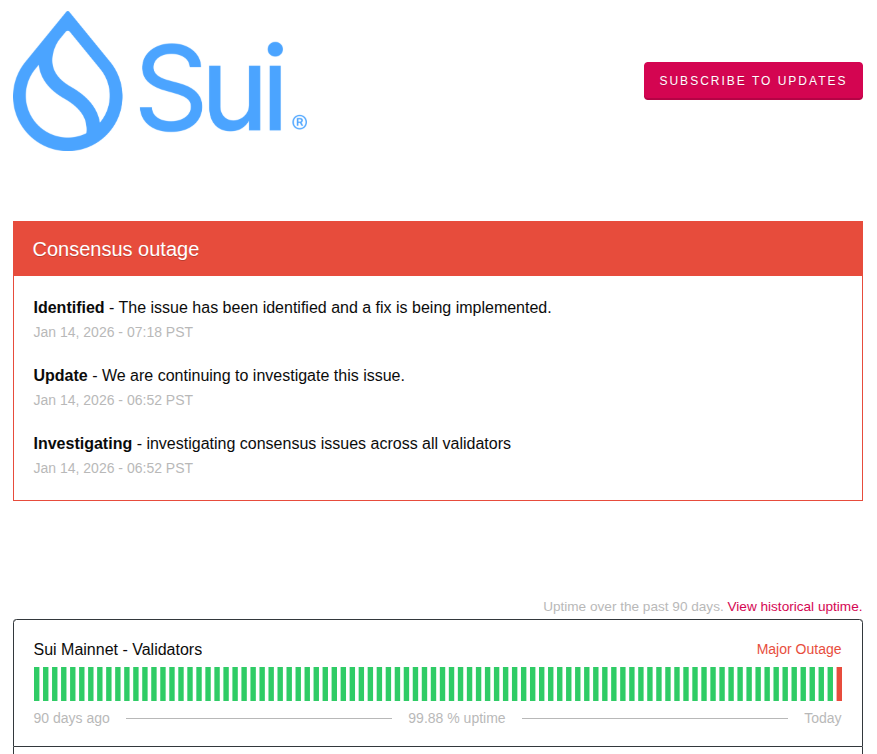 Σύμφωνα με την επίσημη σελίδα κατάστασης του δικτύου, οι validators του Sui αντιμετώπισαν γενικευμένο consensus outage, το οποίο εμπόδισε τη δημιουργία νέων checkpoints και blocks. Το αποτέλεσμα ήταν ένα πλήρες network stall, με το δίκτυο να παραμένει «παγωμένο» για ώρες.