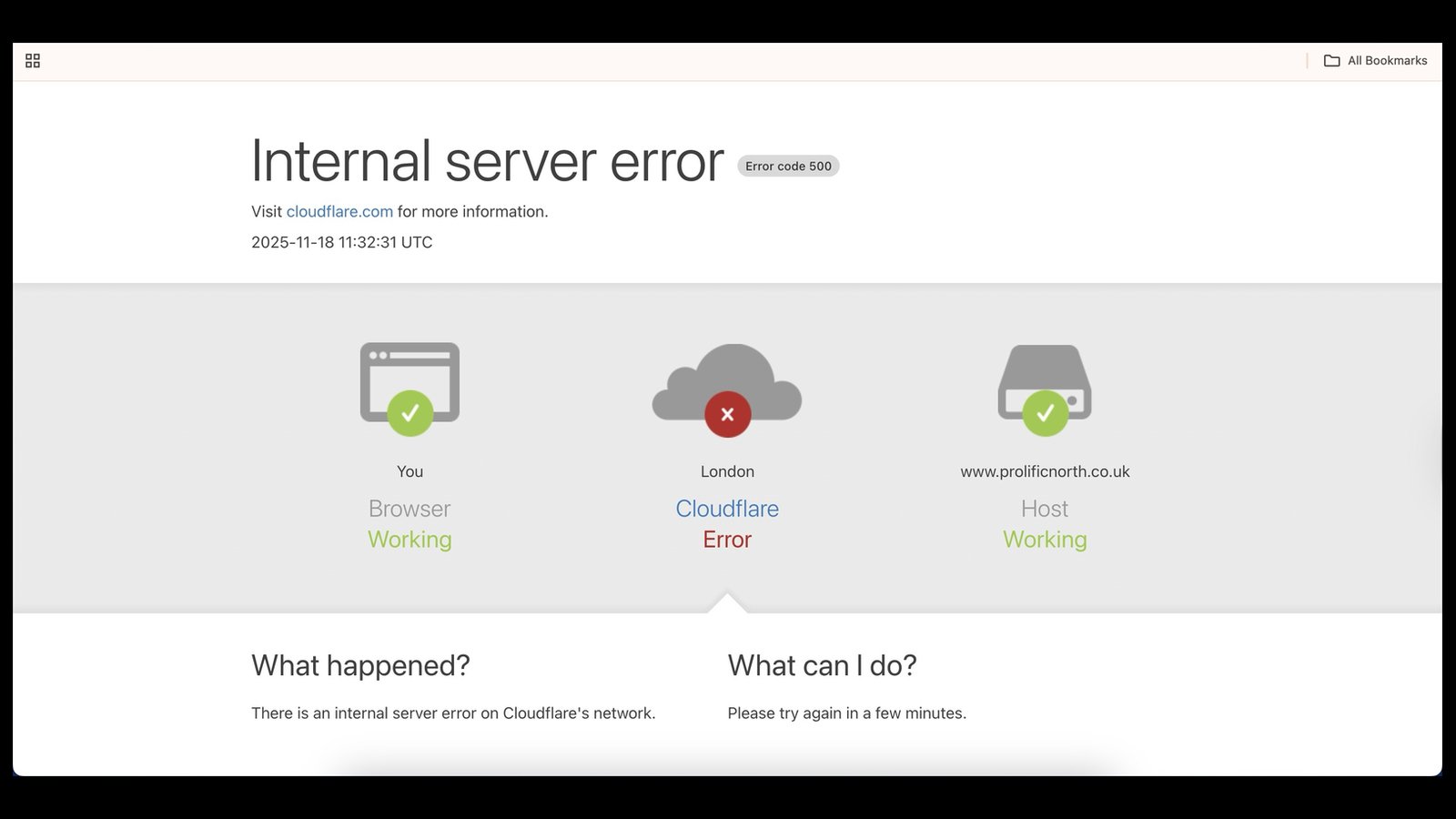 1. Όταν βλέπεις μαζικά 500 errors σε πολλές διαφορετικές ιστοσελίδες, συνήθως δεν φταίει το router σου ή ο υπολογιστής σου, αλλά ένα ενδιάμεσο κομμάτι της υποδομής όπως η Cloudflare.