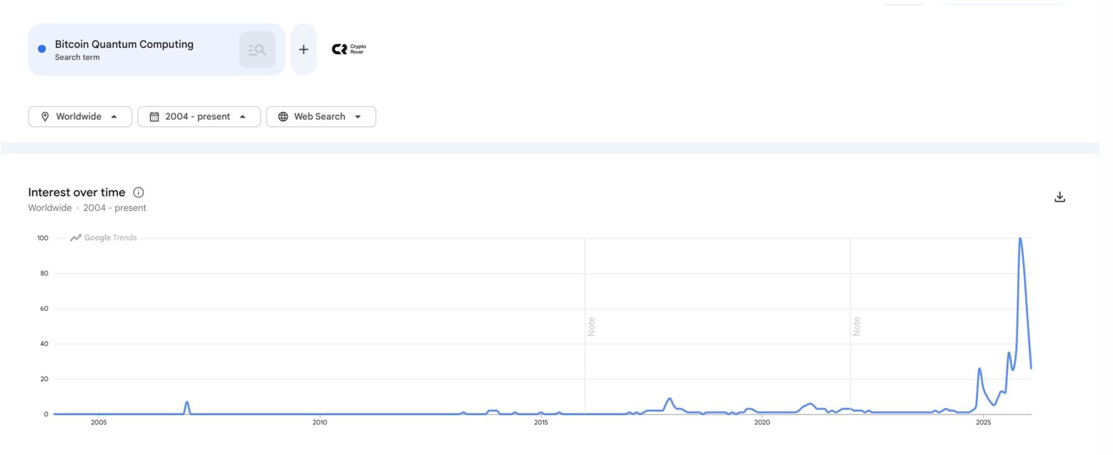 Γράφημα Google Trends που δείχνει απότομη άνοδο στις παγκόσμιες αναζητήσεις για τον όρο «Bitcoin Quantum Computing» το 2025–2026, με το ενδιαφέρον να φτάνει σε ιστορικό υψηλό.