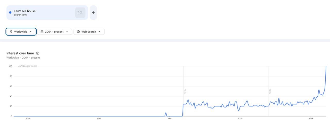 Διάγραμμα Google Trends που δείχνει τις παγκόσμιες αναζητήσεις για τη φράση “can’t sell house” από το 2004 έως σήμερα, με απότομη άνοδο και νέο ιστορικό υψηλό το 2025.