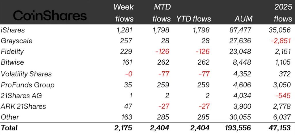 Αναλυτικά, το μεγαλύτερο μέρος αυτού του τεράστιου ποσού κατευθύνθηκε προς επενδυτικά προϊόντα με βάση τις ΗΠΑ, τα οποία απορρόφησαν περισσότερα από $2,05 δισεκατομμύρια. Κυρίαρχο ρόλο έπαιξε το iShares, που συγκέντρωσε πάνω από $1,28 δισεκατομμύρια μέσα σε μια εβδομάδα. Δυναμικές εμφανίσεις καταγράφηκαν επίσης από Grayscale, Fidelity, Bitwise και ARK 21Shares, δείχνοντας ότι τα μεγάλα κεφάλαια δεν κινούνται πια μόνο σε παραδοσιακά προϊόντα, αλλά ρισκάρουν κατευθείαν στην καρδιά των ψηφιακών assets.