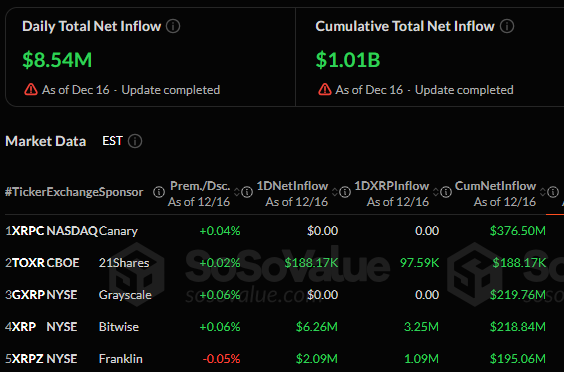 Τα spot XRP ETFs στις ΗΠΑ έγραψαν ιστορία, ξεπερνώντας τα $1 δισεκατομμύριο σε σωρευτικές καθαρές εισροές κεφαλαίων από την στιγμή που ξεκίνησαν να διαπραγματεύονται στις αρχές Νοεμβρίου. Αυτό που ξεχωρίζει είναι πως δεν έχει υπάρξει ούτε μία ημέρα καθαρών εκροών, μόνο συνεχόμενες εισροές κεφαλαίων σε όλες τις συνεδριάσεις μέχρι σήμερα.