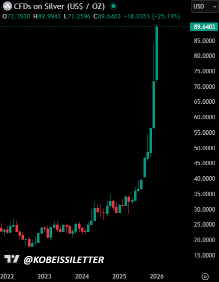 Στο τέλος του 2025, το ασήμι κινούνταν κοντά στα $71–$72 ανά ουγγιά. Μέσα σε λιγότερο από δύο εβδομάδες το 2026, η τιμή επιταχύνθηκε κατακόρυφα, σπάζοντας διαδοχικές αντιστάσεις και μπαίνοντας σε πλήρως παραβολική κίνηση.