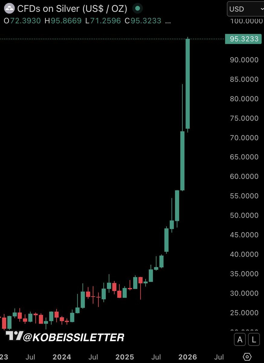 Μέσα σε λιγότερο από έναν μήνα, το ασήμι πέρασε πρώτα τα $90 και στη συνέχεια έσπασε το ψυχολογικό και τεχνικό φράγμα των $95, επιβεβαιώνοντας ότι δεν πρόκειται για απλό speculative spike, αλλά για δομική αλλαγή στη δυναμική του μετάλλου.
