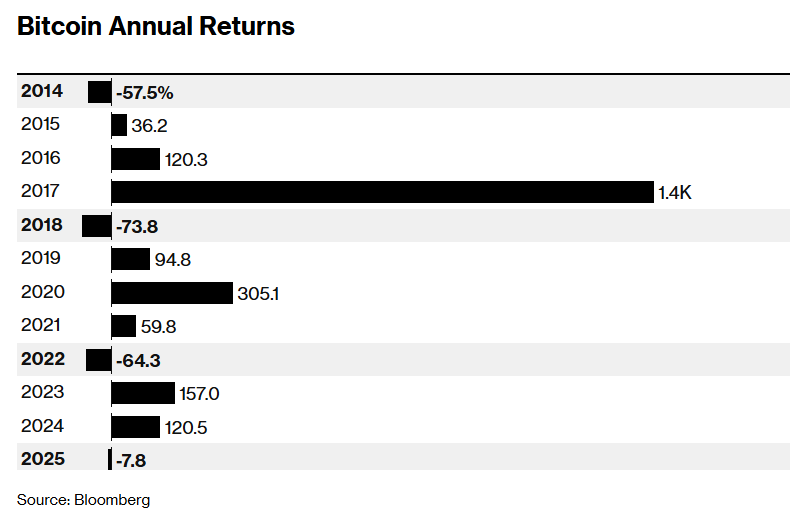 Αν κοιτάξεις τα ετήσια αποτελέσματα του Bitcoin, θα δεις ότι οι πιο μεγάλες πτώσεις συνέβησαν σε χρονιές που υπήρχε μεγάλος «παρονομαστής» πίεσης: