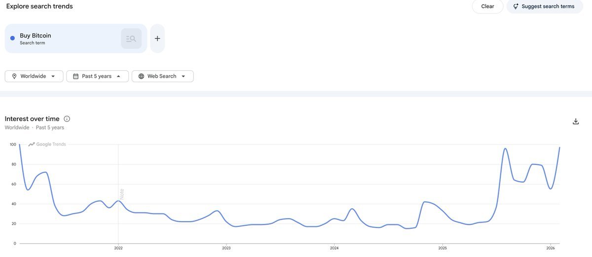 Το Google Trends δείχνει ότι οι παγκόσμιες αναζητήσεις για τον όρο “Buy Bitcoin” αγγίζουν ξανά τα υψηλότερα επίπεδα της τελευταίας πενταετίας. Ο δείκτης ενδιαφέροντος πλησιάζει το 100, δηλαδή το ανώτατο σημείο της κλίμακας για το επιλεγμένο χρονικό διάστημα. Με απλά λόγια, περισσότεροι από ποτέ τα τελευταία χρόνια πληκτρολογούν τη φράση “αγόρασε Bitcoin”.