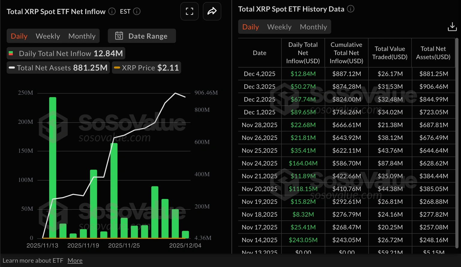 Ο μεγάλος πρωταγωνιστής είναι το Canary XRP ETF (XRPC), που έχει συγκεντρώσει τα περισσότερα κεφάλαια, ενώ το Bitwise XRP ETF και το Franklin XRPZ ακολουθούν με σταθερές εισροές που φτάνουν δεκάδες εκατομμύρια την ημέρα.
