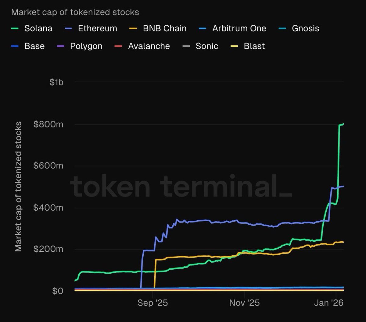 Το συνολικό market cap των tokenized stocks στο Solana αγγίζει πλέον τα 800 εκατ. δολάρια, έναντι περίπου 450 έως 500 εκατ. στο Ethereum. Η BNB Chain ακολουθεί αρκετά χαμηλότερα, ενώ τα υπόλοιπα δίκτυα παραμένουν περιφερειακοί παίκτες στο συγκεκριμένο segment.