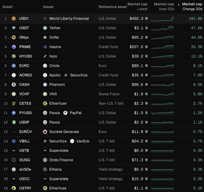 Σύμφωνα με στοιχεία από dashboards που παρακολουθούν tokenized assets ανά blockchain, το market cap του USD1 στο Solana ανήλθε περίπου στα 450 εκατ. δολάρια, από επίπεδα σημαντικά χαμηλότερα μόλις έναν μήνα πριν. Η μεταβολή αυτή αντιστοιχεί σε αύξηση σχεδόν 192% σε μηνιαία βάση, τη μεγαλύτερη που έχει καταγραφεί στο συγκεκριμένο οικοσύστημα για αυτό το χρονικό διάστημα.
