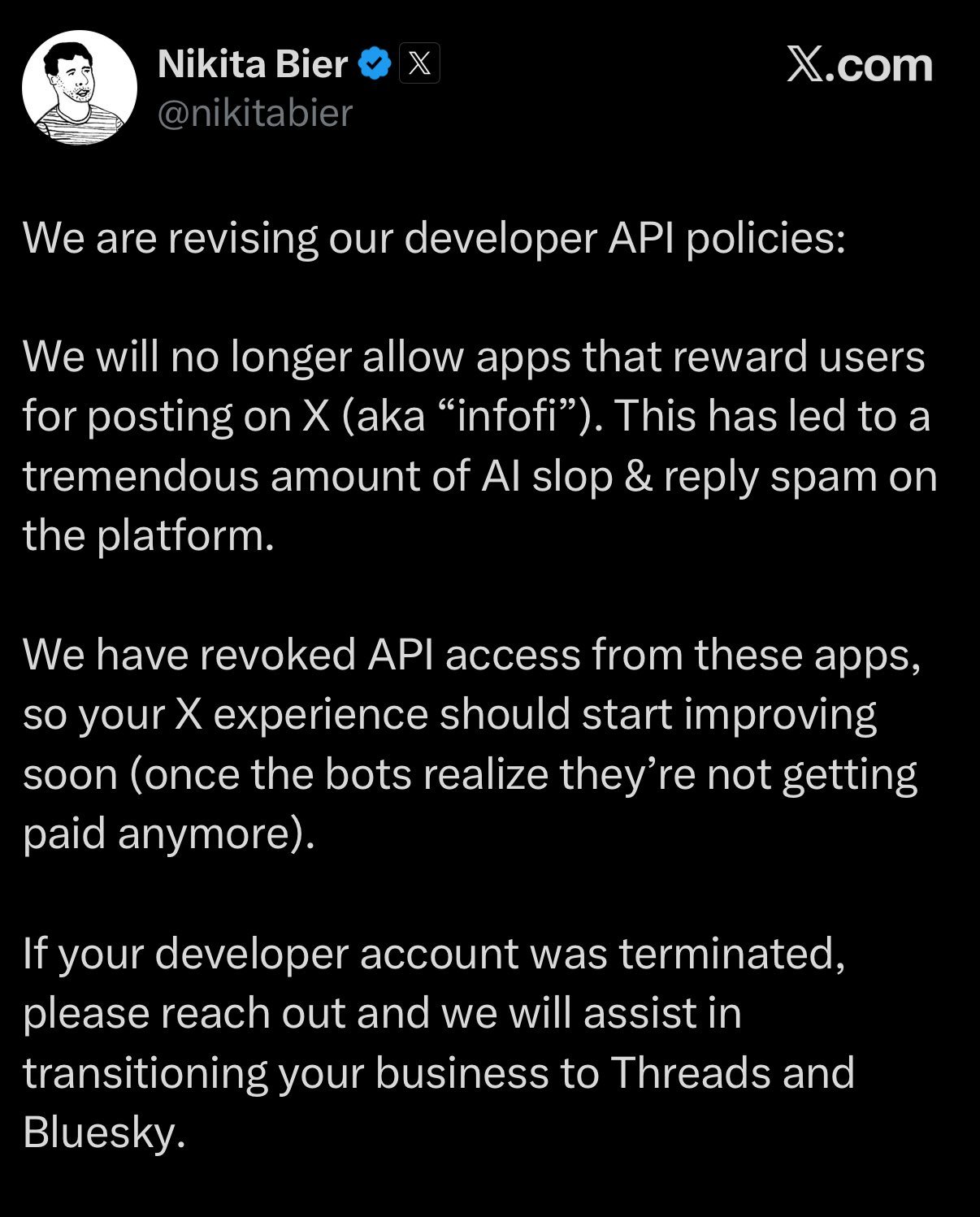 Η ανακοίνωση ήρθε απευθείας από τον Head of Product του X, Nikita Bier, και δεν άφησε κανένα περιθώριο παρερμηνείας. Οι εφαρμογές που πλήρωναν χρήστες για replies, posts ή activity δεν είναι πλέον καλοδεχούμενες. Το API access τους έχει ήδη αφαιρεθεί και το μοντέλο στο οποίο βασίστηκαν απλά… σταματά να υπάρχει.