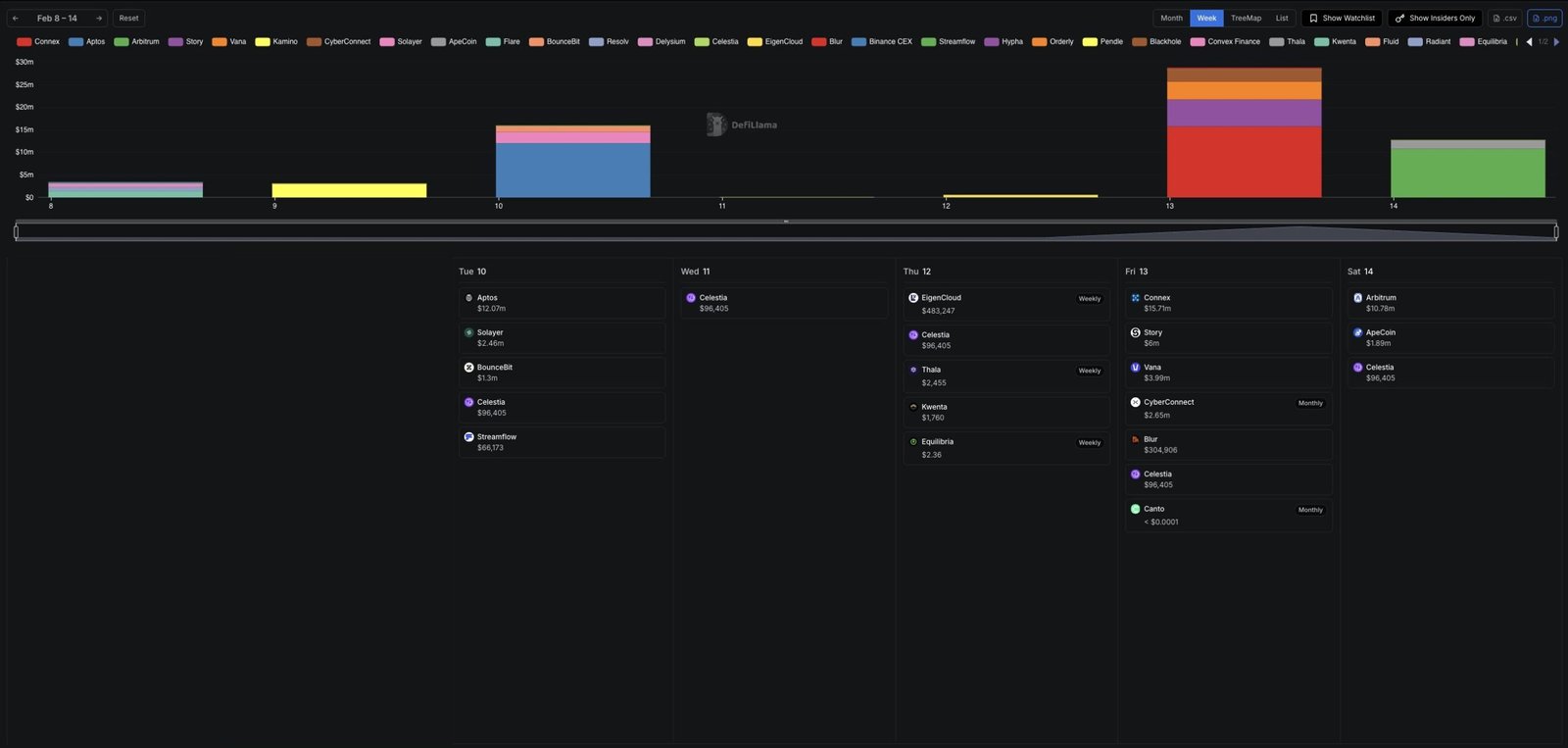 Το ημερολόγιο unlocks για το διάστημα 8–14 Φεβρουαρίου δείχνει ότι η δραστηριότητα δεν είναι ομοιόμορφη. Αντίθετα, συγκεντρώνεται σε συγκεκριμένες ημερομηνίες, με ορισμένα projects να ξεχωρίζουν καθαρά σε όρους αξίας και δυνητικού impact στην αγορά.